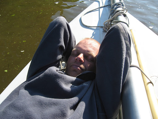 Met een matig windje weten we langs de soiciteit te varen om dan aan te leggen voor de lunch. We hebben een hele kist vol met proviand bij ons. Koffie, water, filters, eieren en brood. We gaan er echt even voor zitten en stellen onze kombuis op de wal op. Wat blijkt, pannetjes vergeten. Dat vroege vertrekken heeft ook alleen maar nadelen. Dan de eieren maar gebakken in de stalen borden die we wel bij ons hebben. Met een half lekke primus op een snel aanbakkend bord worden de roereieren gebakken en toch nog met veel smaak opgegeten. Na deze voedzame maaltijd gaan we op de motor weer verder. Maar dit kan alleen als we de mast eerst laten zakken, het grootzeil gaat namelijk om de een of andere reden niet meer naar beneden....