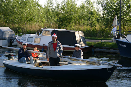 De geplande vertrektijd van 7:00 uur gaan we alvast niet halen. Zoals altijd komt er weer het een en ander tussen voordat we met z'n vijven in de auto met aanhangwagen naar Haarlem vertrekken. Hoe monteer je namelijk een buitenboord motor op een aanhanger zodat ie met 80 km per uur ook nog blijft zitten. Na wat latjes, lijmklemmen en spanbanden te hebben gebruikt lijkt een en ander vast genoeg te zitten en kunnen we op pad.
