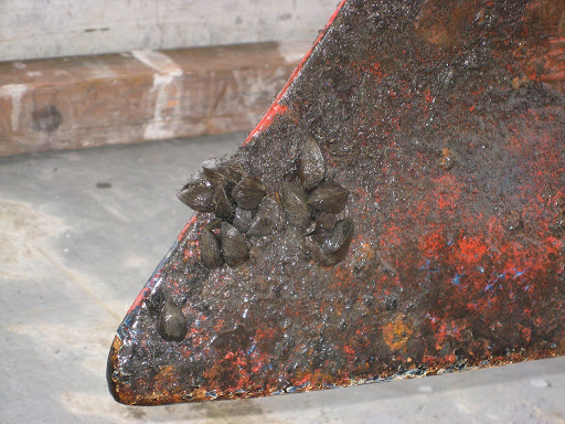 Een eerste inspectie laat zien dat de kiel er zelf eigenlijk heel erg goed aan toe is. Op wat mosselslakken en een enkel putje na is ie mooi gaaf. Wat schuur en plamuurwerk moet er voor kunnen zorgen dat het geheel weer als een mes door het water gaat snijden! We ondersteunen de kiel met een paar flinke houten blokken, zodat deze stevig op zijn plaats blijft ook al ie van de boot gescheiden.